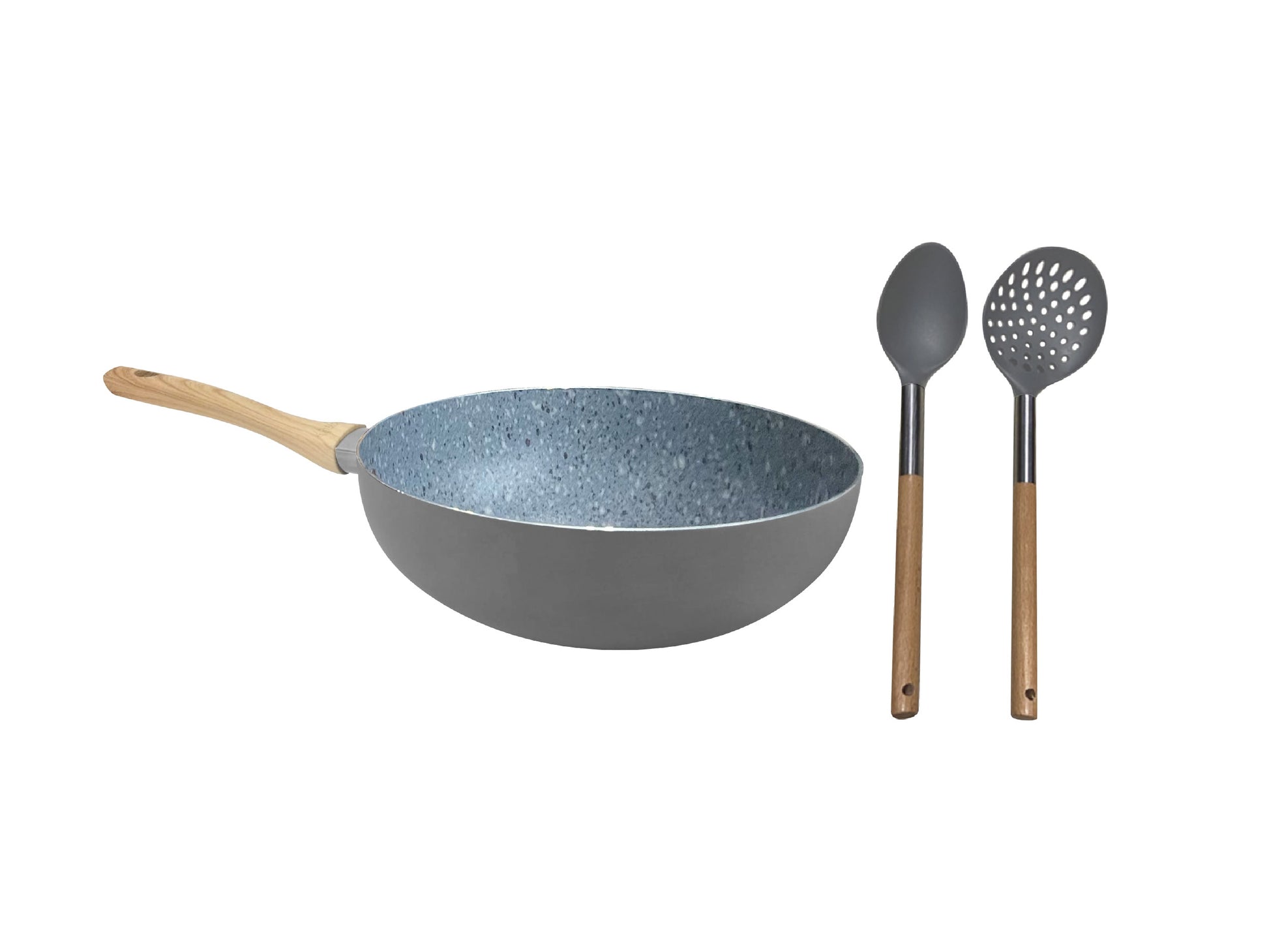 Set de Wok de Aluminio c/ Antiadherente + Espumadera y Cuchara de Madera y Nylon